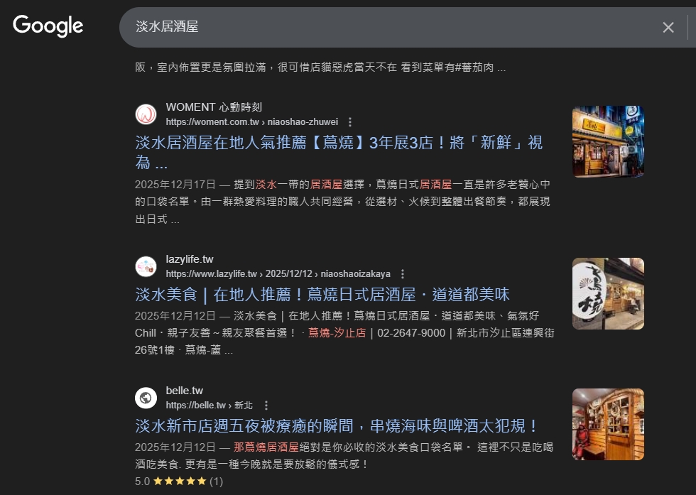 Q4:我想做關鍵字,但附近的居酒屋競爭很激烈,真的排得上去嗎? A: 當然可以,這正是我們 台北行銷公司推薦 團隊的強項! 我們擁有操作連鎖居酒屋(士林/淡水/蘆洲等 5 店全霸榜)的實戰經驗。我們不只做大字,還會分析競爭對手的弱點,挖掘高含金量的長尾關鍵字(例如:蘆洲寵物友善居酒屋、淡水深夜食堂),透過差異化策略,幫您在紅海中殺出一條血路。